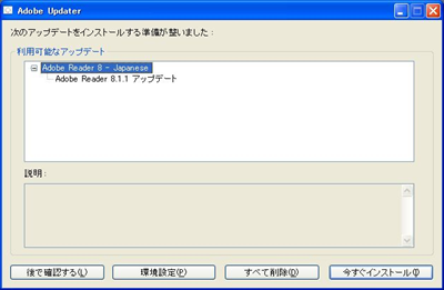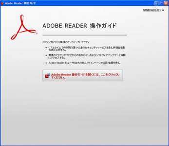 2007年12月2日日曜日Adobe Reader(アドビリーダー)とはPDF形式のファイルを閲覧できる無料のソフトウエアです。嘗てはAdobe Acrobat Readerと言っていましたが、2003年に名前を変更してAdobe Readerになりました。PDFファイルは、どのパソコンでもレイアウトを崩さずに文書を表示・印刷出来るため、商品のカタログや取扱説明書、行政の申請書などの配布に広く利用されています。