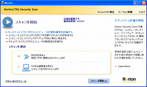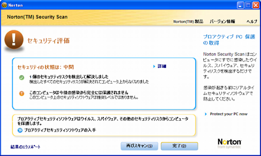 つまりNorton Security Scanで出来ることは「スパイウェアの検出ウイルスの検出と駆除」だけです。 Norton Internet Security 2008 のように「24 時間× 7 日の保護による新種のオンライン脅威の防止とかオンラインでの個人情報の盗難を防止」はできません。