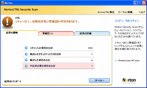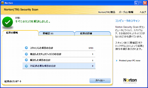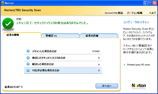 あとはまた「次へ」をクリックしてこのNorton Security Scanを終了させます。