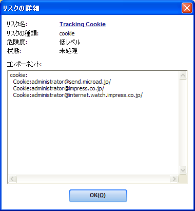 と出たので「OK」をクリックすると「Tracking Cookie」と言うものでした。これはページを見たユーザーが次に何をクリックしたかの追跡をする為のもので、特に害のあるもではありませんが、一応削除して見ます。