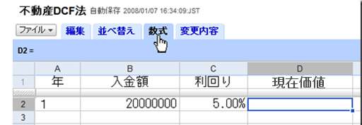 上記の計算は入金額と巻末に載っている複利現価率を掛けて現在価値を出していますが、ここでは関数を使って計算して見ます。