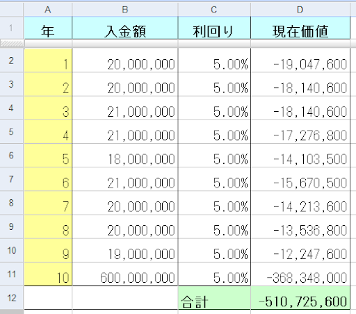 | 収益の現在価値の合計 | 計 510,715,100円 |