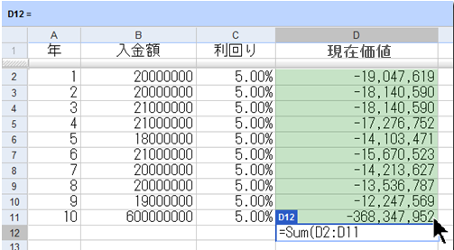 注:現在価値のマイナスはお金が出て行く事を示しています。