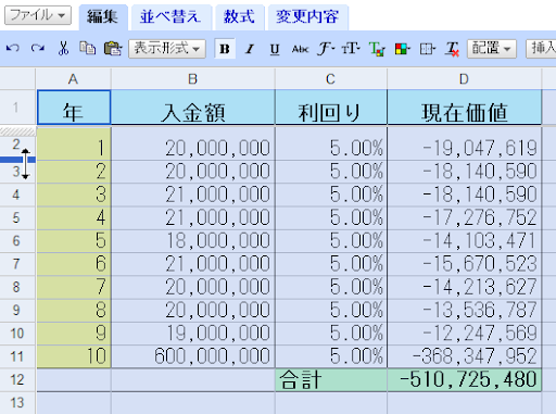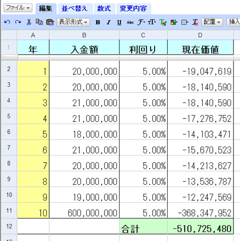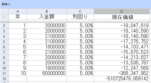 | | 入金額 | 5%の複利現価率 | 現在価値 |